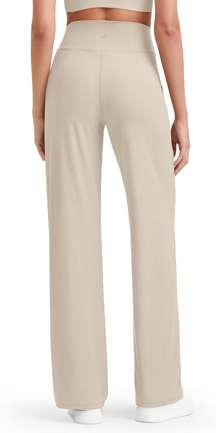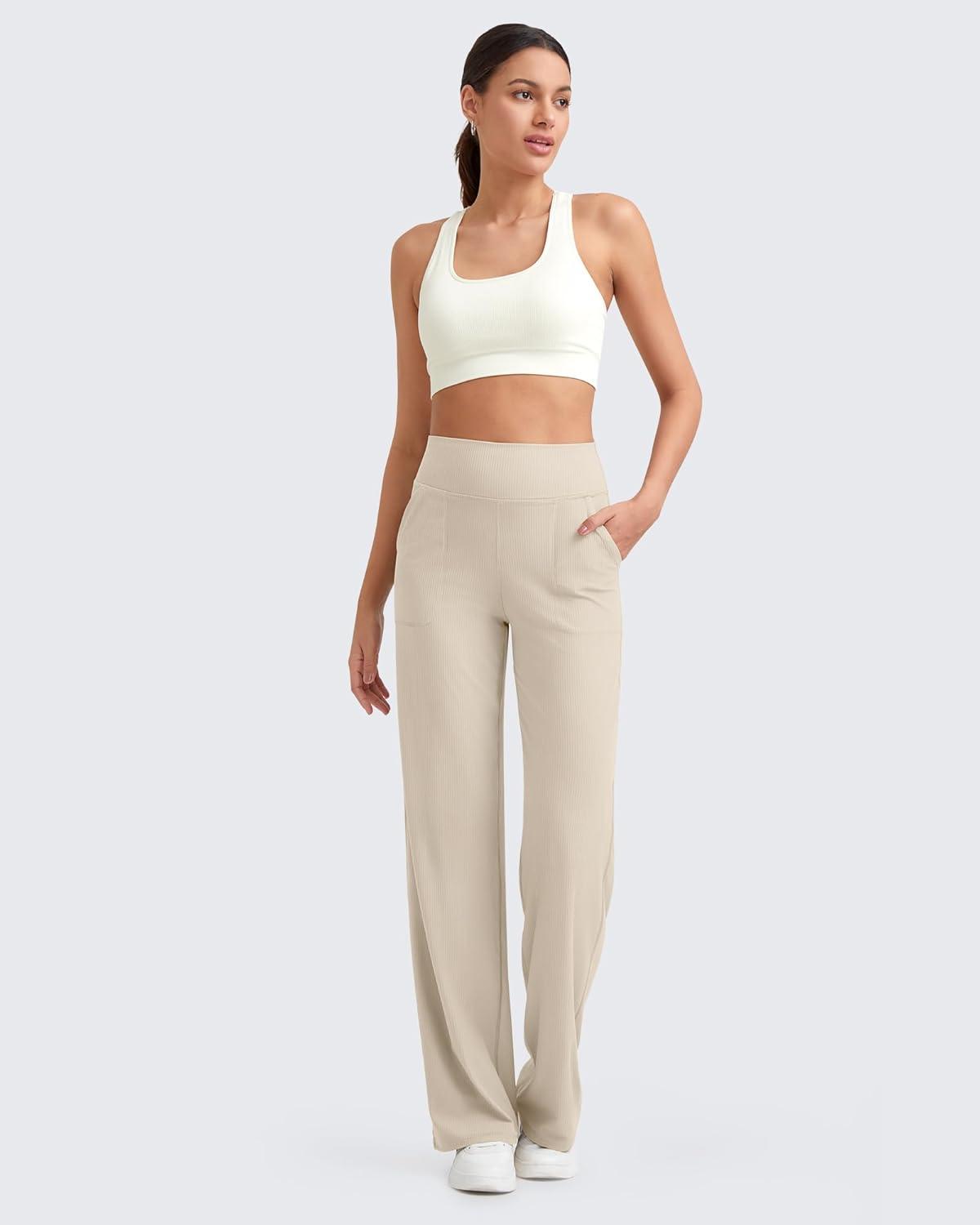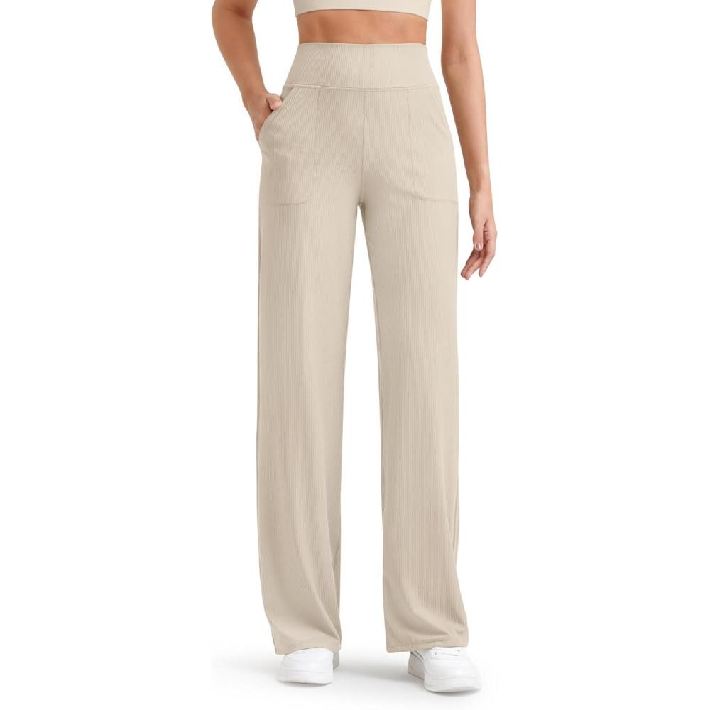 G4Free Womne’s Ribbed Knit Wide Leg Pants with Pockets Lightweight Stretchy Yoga Pants Casual Lounge(Light Khaki)
